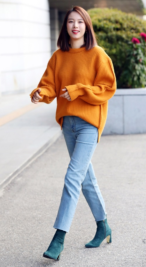 평소 세련된 데일리룩으로 많은 관심을 받는 조윤희는 이 날 오렌지 니트와 청바지에 고급스러운 그린 컬러의 스웨이드 앵클부츠를 매치하여 스타일리쉬하면서도 포인트 있는 출근길 패션을 선보였다.