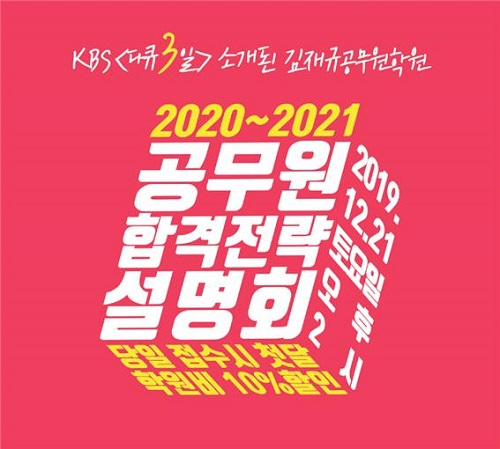 김재규 공무원학원이 오는 12월 21일(토) 오후 2시부터 2020~2021년 대비 공무원 합격전략설명회를 개최한다고 밝혔다.