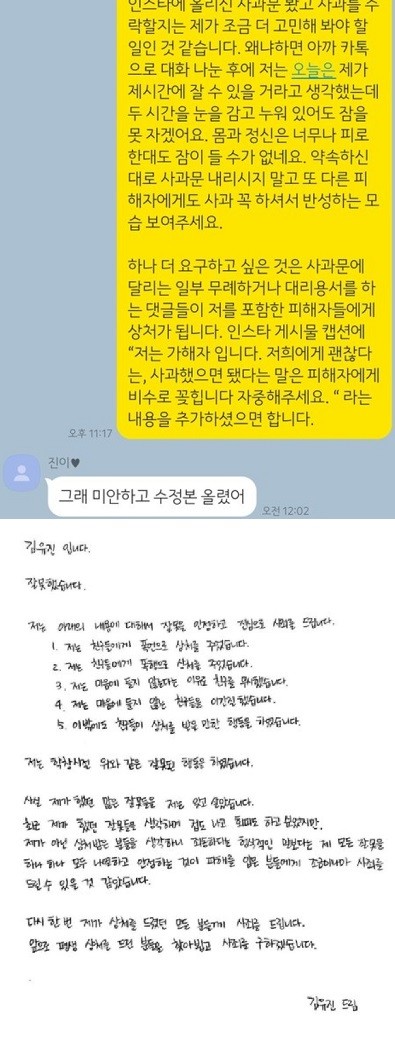 피해자 역시 이런 김유진PD의 태도에 대해 "웃어른 행세하시는 거는 참 기가 차네요"라고 표현했다. 피해자가 김유진PD에게 "하나 더 요구하고 싶은 것은 인스타 게시물 캡션에 '저는 가해자 입니다' '사과했으면 됐다는 말은 피해자에게 비수로 꽂힙니다. 자중해주세요'라는 내용을 추가하셨으면 합니다"라는 메시지를 보냈다. 이에 김유진PD는 "그래 미안하고 수정본 올렸어"라고 답한 것.
