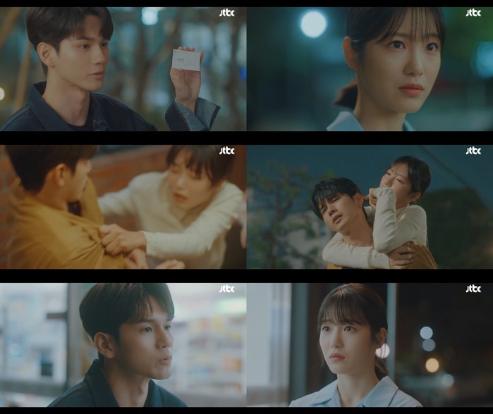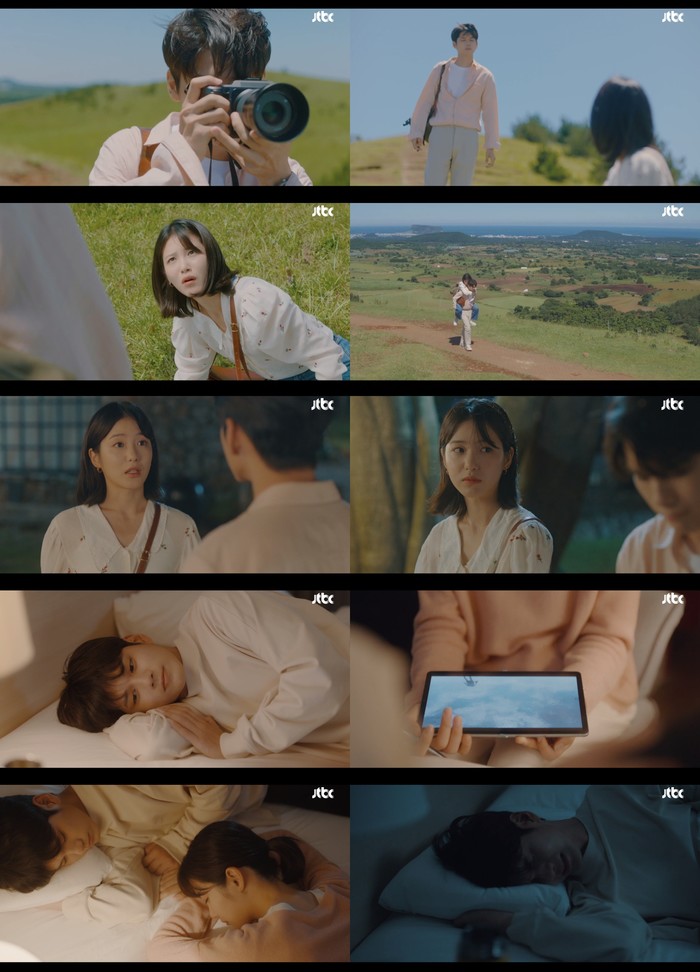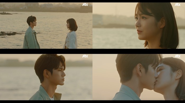 26일 방송된 JTBC 금토드라마 '경우의 수' 2회에서는 힐링 겸 자신의 캘리그라피 엽서를 제주도 책방에 전달하러 간 경우연(신예은)이 3년만에 이수(옹성우)와 재회 후 저주를 푸는 입맞춤을 한 모습이 그려졌다.