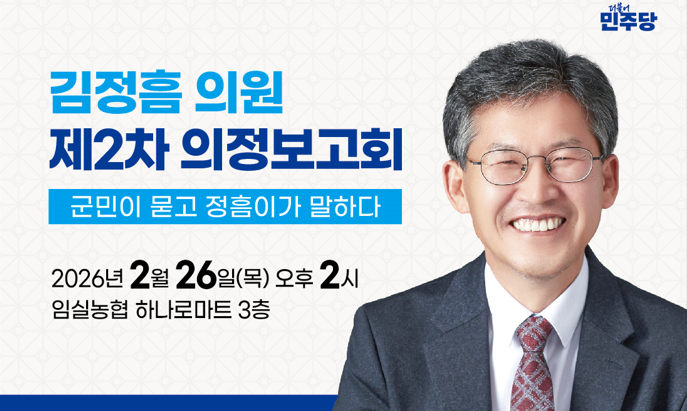 [HBN뉴스 = 이수준 기자] 김정흠 임실군 의회 의원이 2차 의정보고회가 오는 오는 26일 오후 2시 임실농협 하나로마트 3층에서 열린다고 24일 밝혔다.