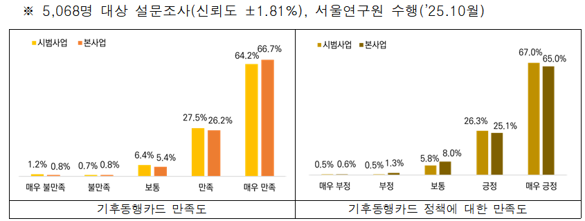 이용자 만족도도 높았다. 기후동행카드 사용자 5,068명 대상 설문 결과, 이용자 92.9%가 만족(매우만족,만족)한다고 답했고, 90.1%는 정책을 긍정적(매우긍정, 긍정)으로 평가하고 있다고 밝혔다.