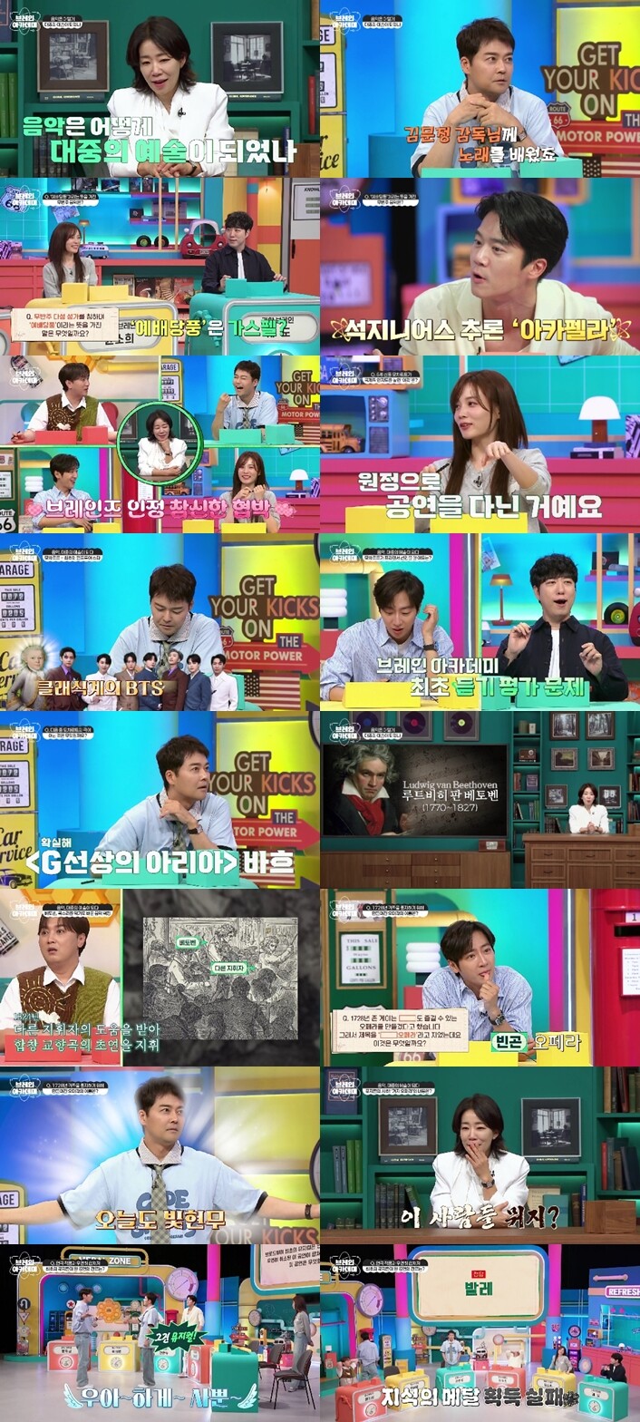 이날 ‘음악 마스터’로 출연한 김문정 음악감독은 “음악이 어떻게 대중의 예술이 됐는지 알아보자”는 주제를 선포한 뒤, “음악을 배워본 적이 있냐”고 모두에게 물었다. 전현무는 “감독님께 노래를 배우지 않았냐”며 한 소절을 뽑았으나, 김문정 감독은 눈을 질끈 감아 폭소를 안겼다. 뒤이어 김문정 감독은 “무반주 다성 성가를 칭하는 말로 ‘예배당 풍’이라는 뜻을 가진 용어는?”이라는 첫 퀴즈를 냈다. 궤도는 “가스펠”이라며 ‘홀리’한 답을 내놨으나, 하석진은 “채플(예배)이 샤펠이니까 아카펠라 아니냐?”고 추론했고 이는 정답이었다.
