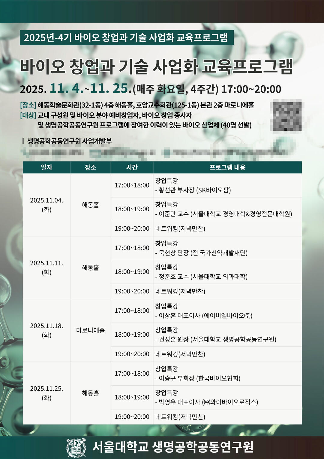 [HBN뉴스 = 이동훈 기자] 서울대학교 생명공학공동연구원(원장 권성훈)이 오는 11월 4일부터 11월 25일까지 매주 화요일 오후 5시부터 8시까지 ‘2025-4기 바이오 창업과 기술사업화 교육프로그램’을 개최한다. 본 과정은 바이오 창업과 기술사업화를 주제로, 실무 중심 강연과 산학 네트워킹을 결합한 실질적 교육 프로그램이다.