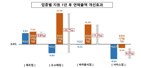 비참여 업체 대비 연매출액 개선 효과는 ▴도소매업이 22.7%p로 가장 높았으며 ▴숙박음식업(11.3%p) ▴서비스업(6.3%p) ▴제조업(0.8%p) 순으로 뒤를 이었다.