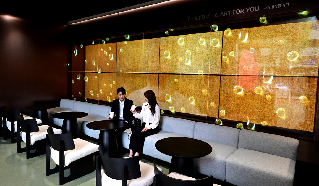 1층은 고객을 맞이하는 공간으로 상담을 기다리는 동안 LG전자의 OLED 기술로 구현된 예술 작품을 감상할 수 있다. 투명 OLED 기반의 대형 디지털월에서는 LG전자가 후원하는 한국 현대미술 작품이 전시된다. 고(故) 김창열 화백의 대표작 ‘물방울을 그리는 남자’를 비롯해 다양한 작품들이 소개된다.
