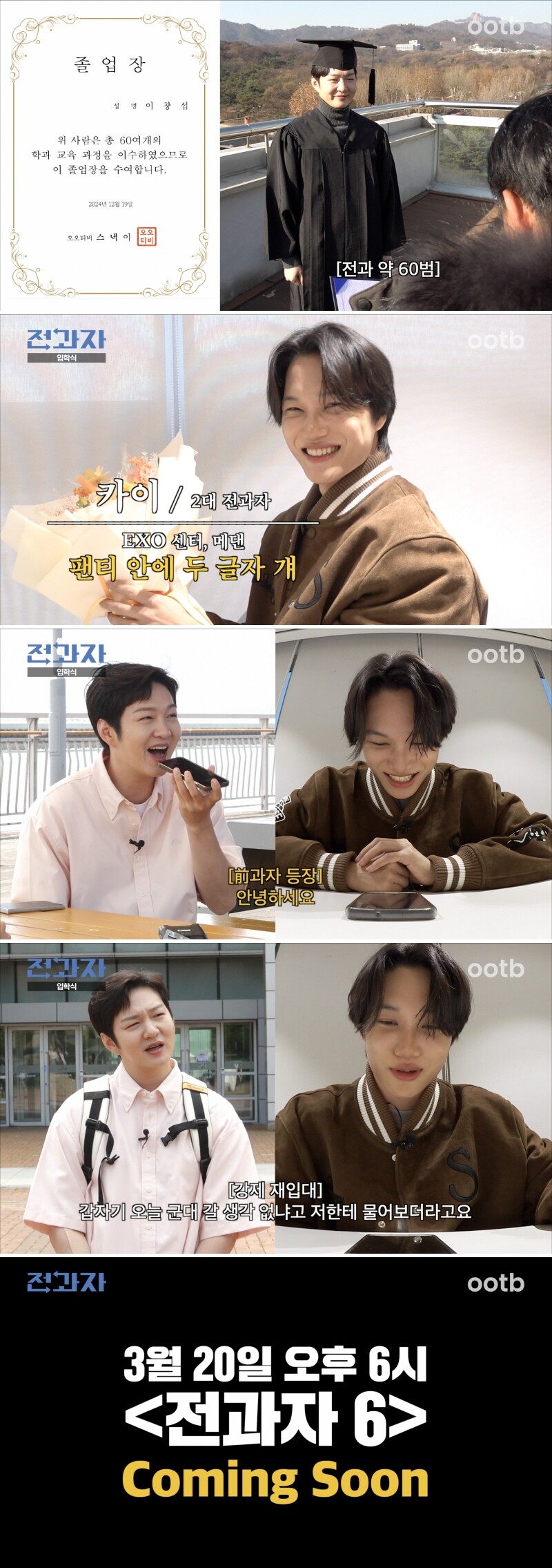 그간 육군사관학교와 공군사관학교 등을 방문했던 이창섭의 뒤를 이어 카이 또한 ‘재입대 길’을 걷게 될지 기대를 모으는 가운데, ‘예능 새싹’ 카이가 남다른 예능감과 친근함을 마음껏 뿜어낼 ‘전과자’ 시즌6에 관심이 쏠린다.