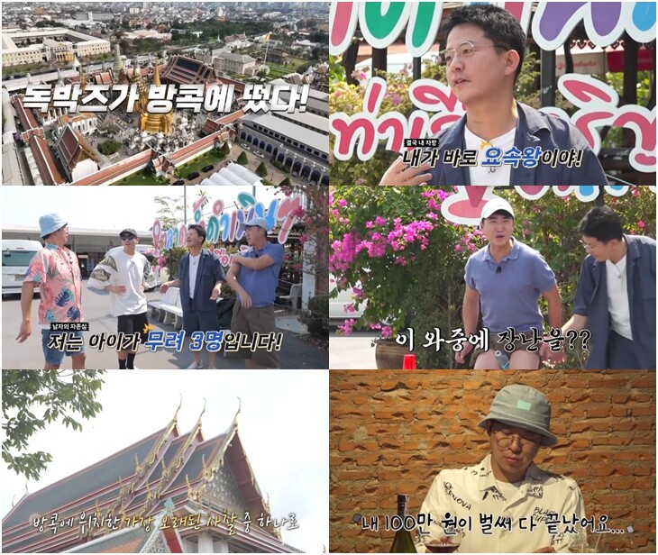 모두가 자신의 승리를 점치는 가운데, 김준호는 게임 전, 유세윤을 견제하는 한편 ‘리스펙’한다. 그는 운동으로 다져진 ‘관리남’ 유세윤의 허벅지를 만지더니 “(이거) 만져 봐! 단단해!”라며 ‘입틀막’한다. 과연 ‘평균 나이 47.세’인 ‘독박즈’가 남자의 자신감을 건 ‘물발 대결’에서 어떤 승부를 펼칠지에 궁금증이 솟구친다. 그런가 하면 이날 ‘독박즈’는 수상시장 투어 후 “방콕에서 가장 큰 와불상이 있는 사원으로 가보자”며 태국의 필수 관광 코스인 왓포 사찰로 향해 기대감을 드높인다.