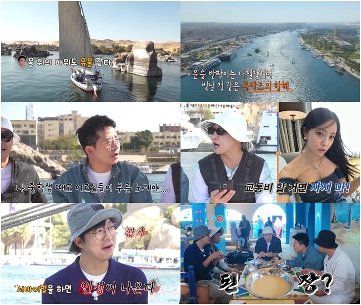 이날 ‘독박즈’는 카이로에서 ‘슬리핑 기차’를 타고 무려 16시간을 달려 ‘문화의 도시’ 아스완에 도착한다. 아름다운 나일강 뷰를 품은 아스완의 절경에 감탄한 홍인규는 “이곳이 클레오파트라가 신혼여행으로 왔을 정도로 예쁜 도시라 하더라”며 설렘을 드러낸다. 이후 ‘독박즈’는 아스완의 유명한 관광지인 ‘누비안 빌리지’로 가기 위해 ‘펠루카’(이집트 전통 배)에 탑승한다. 바람과 돛을 이용해 나일강을 건너는 ‘펠루카’의 낭만에 꽂힌 ‘독박즈’는 배 위에서 ‘꽃보다 F5’를 결성해 ‘자뻑 모드’를 보인다.
