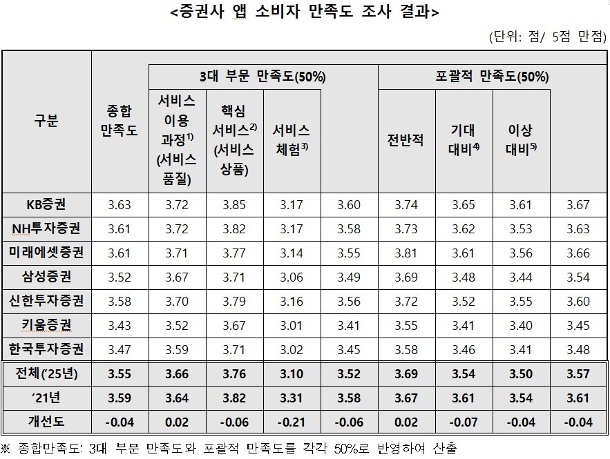 키움증권(영웅문S#·3.43점), 한국투자증권(한투·3.47점), 삼성증권[016360](mPOP·3.52점)이 평균 3.55점에 미치지 못하는 성적표를 받았다.