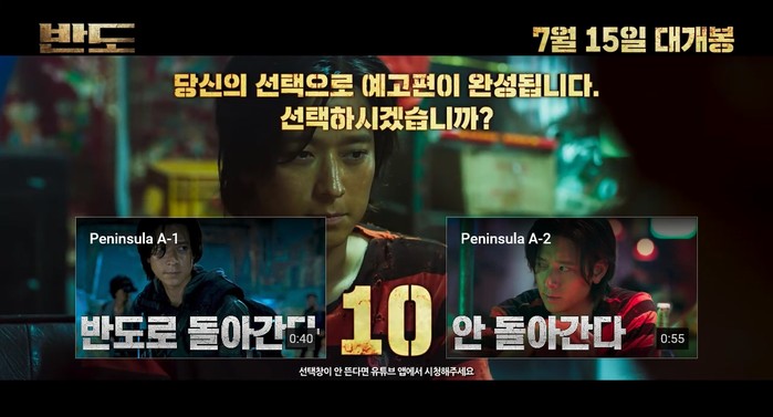 한국 영화 사상 최초로 선보이는 인터랙티브 예고편은 전대미문의 재난 4년 후, 가까스로 탈출해 홍콩에 정착했지만 무기력한 삶을 이어가고 있는 생존자 정석(강동원)으로 전개된다. 한 명당 250만 불이 걸린 어려운 제안을 받고 폐허의 땅 반도로 다시 돌아갈 것인지, 돌아가지 않을 것인지를 선택할 수 있는 시간은 단 10초.