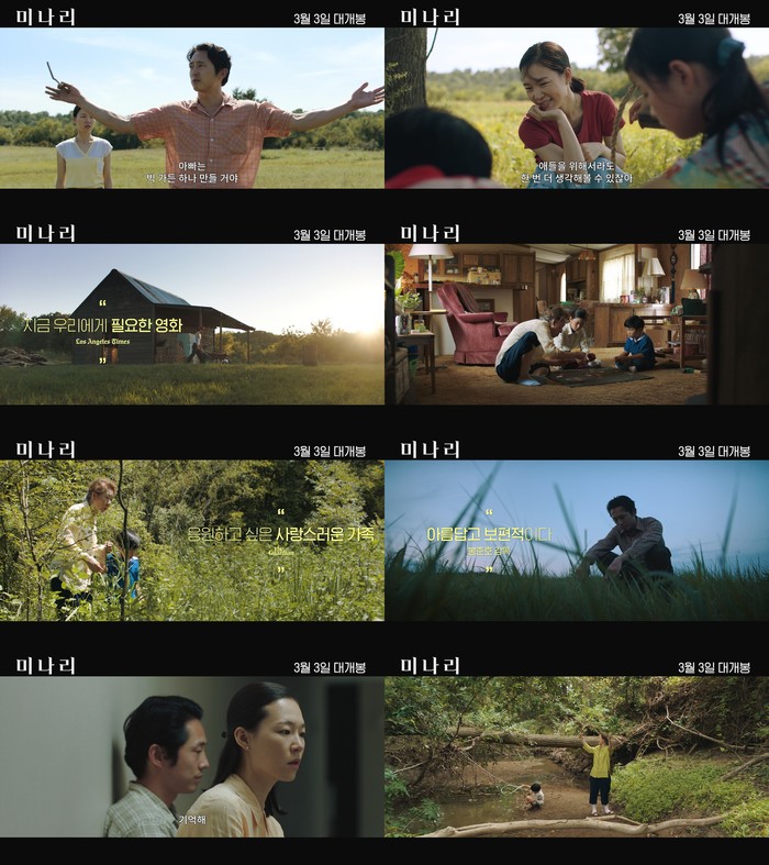 낯선 미국에 도착한 한국 가족의 첫걸음부터 희망을 뿌리내리는 여정을 그린 영화 <미나리>가 골든 글로브 외국어영화상 및 미국배우조합상(SAG) 영화 부문 앙상블상, 여우조연상, 남우주연상 후보에 오르며 전 세계 59관왕 113개 노미네이트를 기록해 할리우드 이목을 집중시키고 있는 가운데 3월 3일 국내 개봉을 앞두고 2차 포스터 2종, 메인 예고편을 전격 공개해 기대감을 고조시킨다.