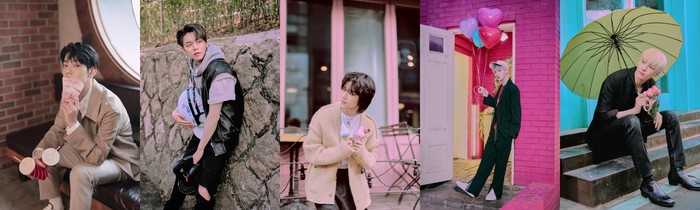 이어 공개된 개인 콘셉트 포토에는 무드 티저 속 소품을 들고 있는 다섯 멤버의 모습이 담겼다. 무엇보다도, 멤버들의 소품과 그 모습이 커플을 연상케 해 특별함을 더했다. 두 장의 영화표와 음료를 들고 있는 수빈, 자신의 것과 똑같은 헬멧을 들고 선 연준, 그리고 범규는 두 개의 아이스크림을 들고 누군가를 기다리고 있다. 하트 모양의 풍선을 든 태현과 꽃다발을 쥔 휴닝카이 역시 ‘누군가’가 올 것 같은 방향을 바라보는 모습으로 풋풋하면서도 설레는 감정을 동시에 표현했다.