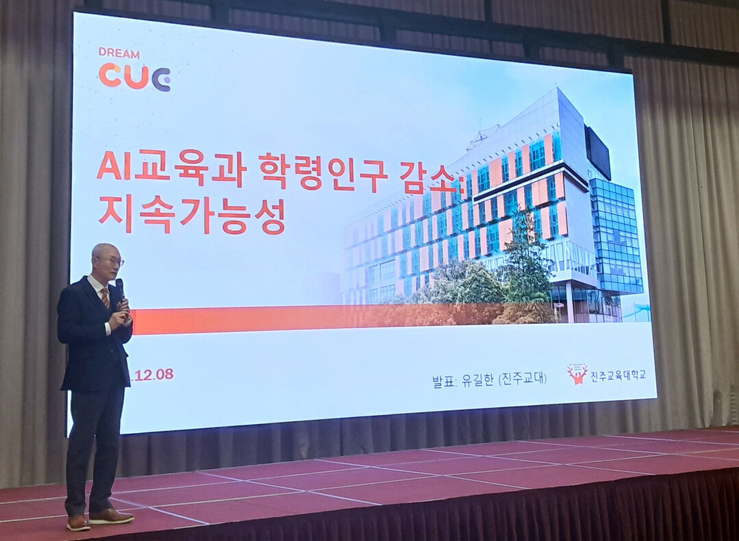 | 세종대 교육대학원의 ‘2025학년도 학술대회’에서 유길한 진주교육대학교 교수가 기조강연을 하고 있다. [사진=세종대학교] |