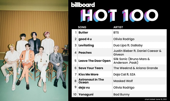 방탄소년단은 'Dynamite'(3회)로 한국 가수 최초 '핫 100' 1위를 달성한 이래 피처링에 참여한 'Savage Love' 리믹스 버전(1회), 앨범 'BE'의 타이틀곡 'Life Goes On'(1회), 그리고 'Butter'(3회)까지 통산 8번 '핫 100' 정상을 밟았다.