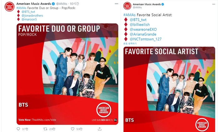 방탄소년단은 지난 2018년부터 '아메리칸 뮤직 어워드'와 연을 맺고 있다. 2018년 처음 '페이보릿 소셜 아티스트'를 수상한 이래 올해까지 3년 연속 해당 부문에 노미네이트 되며 독보적인 글로벌 인기를 입증했다.