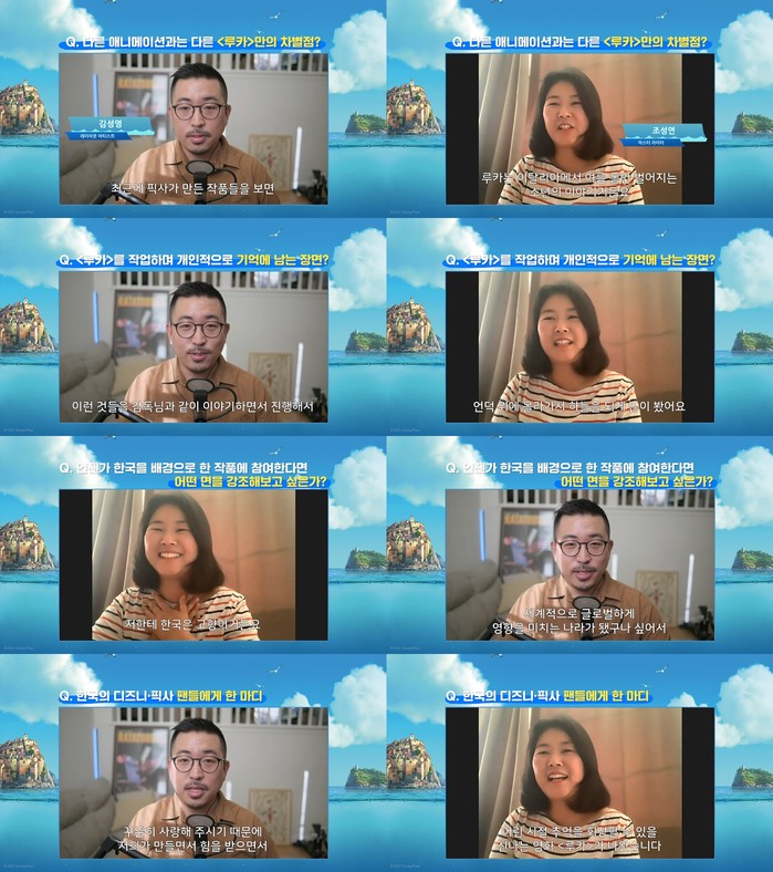 한국의 디즈니·픽사 팬들을 위한 특별한 질문도 눈길을 끈다. 언젠가 한국을 배경으로 한 작품에 참여한다면 어떤 면을 강조해보고 싶은지 묻는 질문에 대해 조성연 마스터 라이터는 "나에게 있어 한국은 언제나 그리워하는 고향"이라며, 한국의 전통적인 것을 표현하는 애니메이션에 대한 소망을 전했다. 김성영 레이아웃 아티스트는 세계적으로 영향을 미치는 나라가 된 한국에 대한 자부심을 드러내며, “한국의 역동성과 그로부터 오는 에너지를 녹여내고 싶다”고 밝혔다. 마지막으로 두 아티스트들은 "해외여행을 가기 힘든 상황인데 올여름 이탈리에 바닷가 마을을 배경으로 청량한 이미지들을 큰 스크린에서 확인해보길 바란다"라는 당부와 함께 디즈니·픽사에 꾸준히 애정과 관심을 표현해준 팬들에 대한 진심 어린 감사의 인사를 건넸다.