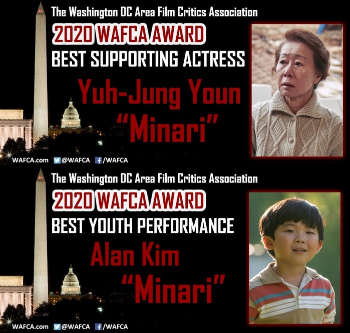 워싱턴 DC 비평가협회 여우조연상을 수상한 윤여정은 영화 속 희망을 키워가는 할머니 ‘순자’ 역을 맡아 전미 비평가위원회부터 LA, 보스턴, 노스캐롤라이나, 오클라호마, 콜럼버스, 그레이터 웨스턴 뉴욕, 샌디에이고, 뮤직시티, 샌프란시스코, 세인트루이스, 노스텍사스, 뉴멕시코, 캔자스시티, 디스커싱필름, 뉴욕 온라인, 미국 흑인 비평가협회와 미국 여성 영화기자협회, 골드 리스트 시상식, 선셋 필름 서클 어워즈까지 연기상 21관왕을 달성하며 새로운 길을 열고 있다.