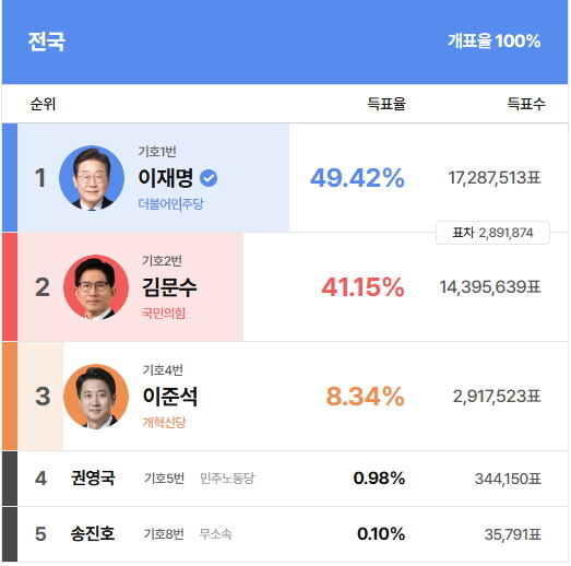 4일 중앙선거관리위원회에 따르면 이날 오전 6시쯤 개표가 100% 완료된 결과, 이재명 후보는 49.42%, 김문수 국민의힘 후보는 41.15%, 이준석 개혁신당 후보는 8.34%를 각각 기록했다.