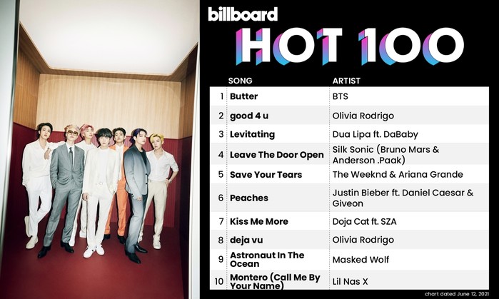 [하비엔=노이슬 기자] 그룹 방탄소년단이 새 디지털 싱글 'Butter'로 미국 빌보드 메인 싱글 차트 '핫 100'(6월 12일 자)에서 2주 연속 정상을 차지했다.