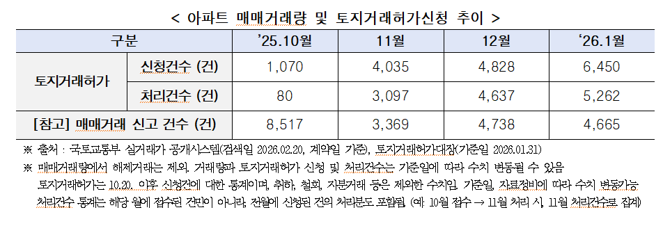 서울 전역 토지거래허가제 시행 이후 ’26년 1월 말 기준 아파트 토지거래허가 누적 신청건수는 총 16,683건으로, 이 중 13,076건(79.8%)이 처리됐다.