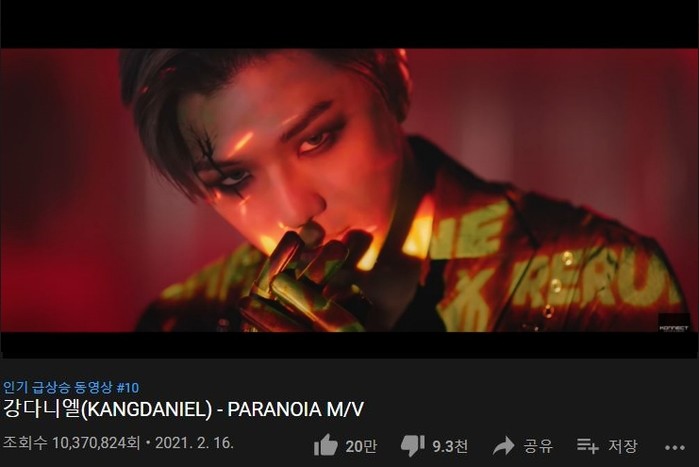 [하비엔=노이슬 기자] 강다니엘의 'PARANOIA' 뮤직비디오가 49시간 만에 1천만뷰를 돌파했다.