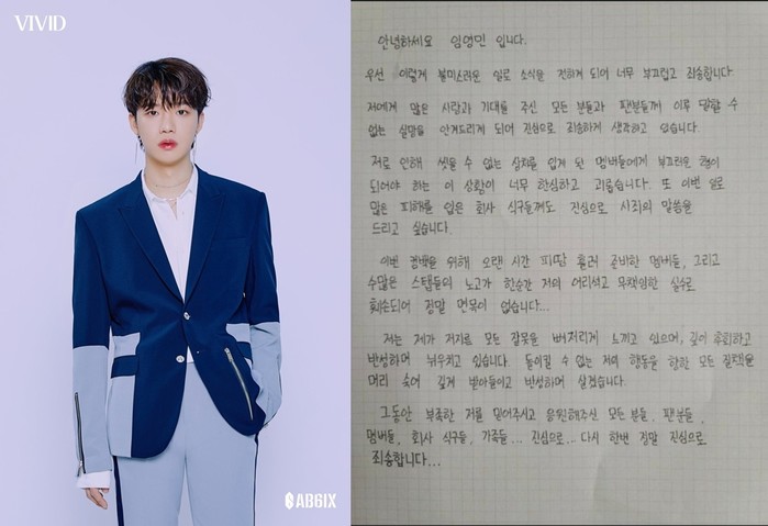 [하비엔=노이슬 기자] 음주운전으로 물의를 일으킨 AB6IX 임영민이 자필편지를 통해 사과했다. 하지만 그의 사과에도 일부 팬들은 '민폐'를 끼쳤다며 탈퇴 촉구의 목소리를 높이고 있다.