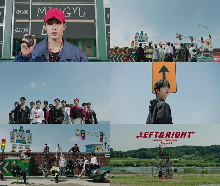 이어 각기 다른 방향으로 뻗은 표지판을 유심히 바라보는 세븐틴이 등장해 시선을 사로잡았고 멤버들은 ‘Left & Right’ 박자에 맞춰 좌우로 고개를 틀며 유니크한 장면을 연출했다.