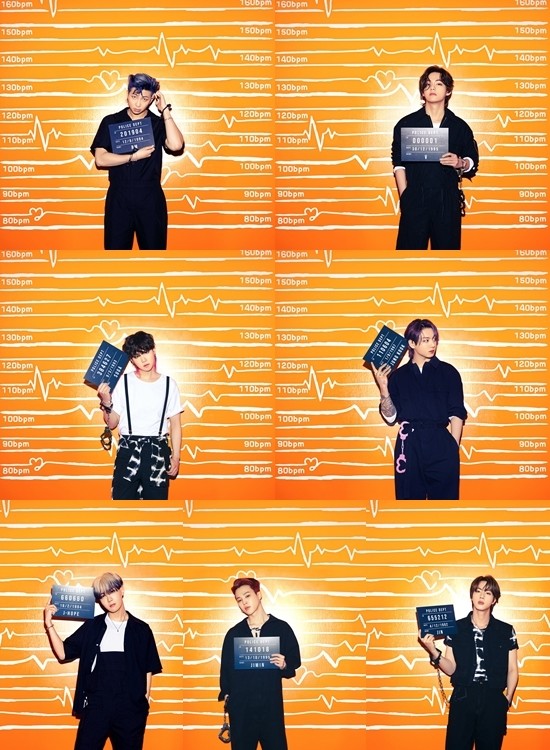 단체 사진에서는 주황색 바탕에 심박수가 그려져 있는 배경이 특징. 강렬한 눈빛으로 카메라를 응시하는 방탄소년단의 모습 또한 인상적이다. 일곱 멤버는 개별 컷에서도 저마다 다른 표정으로 개성 넘치는 머그샷을 완성했다.
