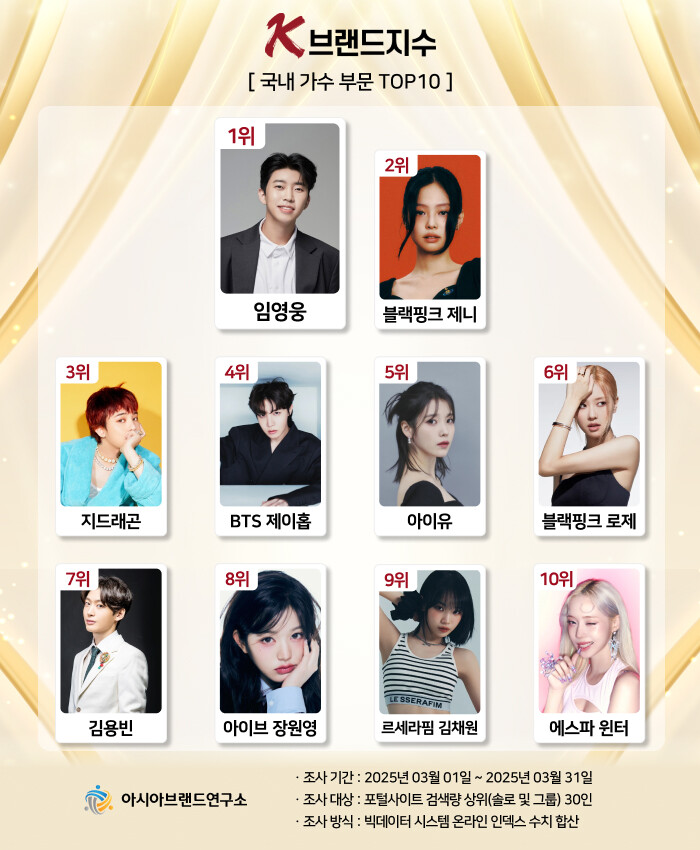 아시아브랜드연구소 관계자는 “K-브랜드지수 가수 부문 최정상을 탈환한 임영웅은 최근 싱글 ‘천국보다 아름다운’을 통해 감성 장인의 면모를 선보이며 호평을 받았다”며 “특히 한류 스타의 존재감을 입증한 블랙핑크 제니와 로제, 차세대 트롯 스타로 급부상한 김용빈의 활약은 눈여겨볼 필요가 있다”라고 말했다.