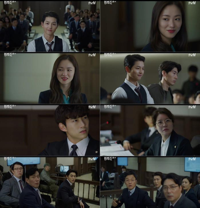 이날 방송에서는 빈센조(송중기 분), 홍차영(전여빈 분)이 금가프라자 패밀리와 의기투합해 재판을 엎어버리는 초강력 한 방을 날렸다. 상상을 초월하는 묘수로 재판을 연기시킨 빈센조. 다크 히어로들의 신박하고 경이로운 활약은 사이다를 안겼다. 분노한 빌런들의 인정사정없는 역습도 시작됐다. ‘독사’ 최명희(김여진 분)는 증인들에게 누명을 씌워 빈센조와 홍차영을 궁지에 몰았다. 하지만 두 사람은 이대로 물러서지 않았다. 2차 변론기일, 홍차영은 재정증인을 신청했다. 그리고 법정에는 빈센조가 들어섰다. 위풍당당하게 걸어 들어오는 빈센조의 눈부신 아우라는 짜릿한 반전을 예고하며 기대감을 높였다.