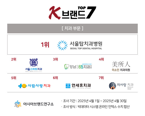 ‘K-브랜드 톱7’ 치과 부문은 서울탑치과병원이 1위의 영예를 차지한 가운데, 2위 서울스마트치과의원, 3위 강남365치과의원, 4위 미소인치과의원, 5위 사람사랑치과의원, 6위 연세휴치과의원, 7위 미사랑치과의원 등이 이름을 올렸다.