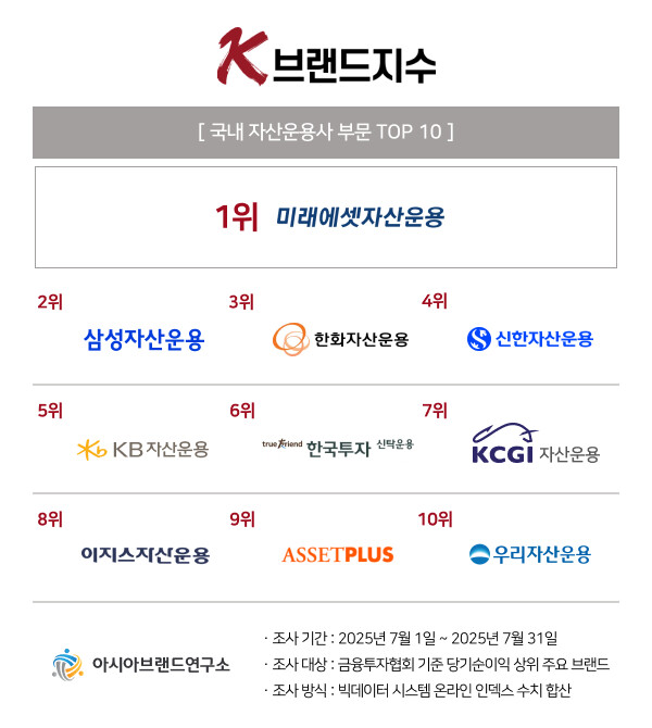 ‘K-브랜드지수’ 자산운용사 부문은 1위 미래에셋자산운용에 이어 삼성자산운용(2위), 한화자산운용(3위), 신한자산운용(4위), KB자산운용(5위), 한국투자신탁운용(6위), KCGI자산운용(7위), 이지스자산운용(8위), 에셋플러스자산운용(9위), 우리자산운용(10위)이 TOP10에 이름을 올렸다.