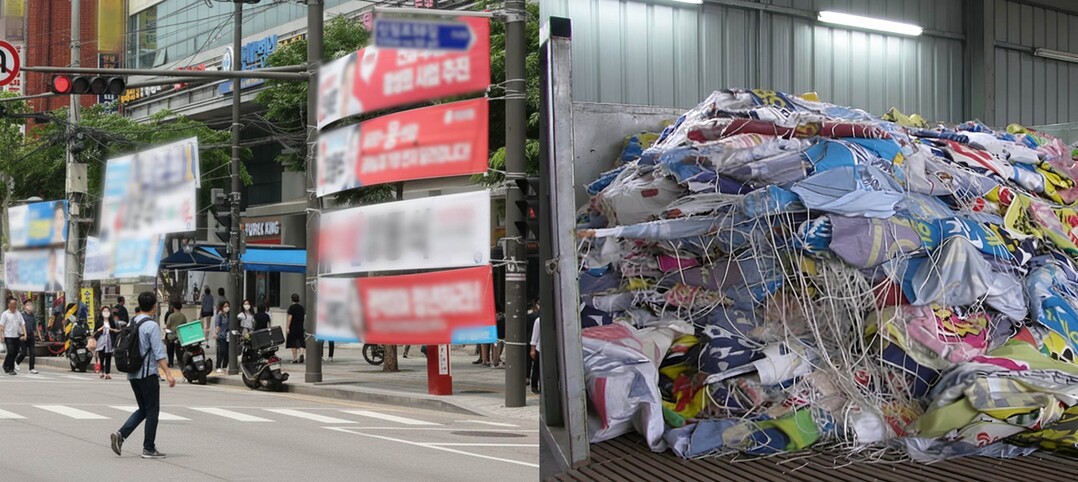 현재 선거 현수막 대부분은 PVC나 PE 타포린 소재로 제작된다. 내구성은 뛰어나지만 재활용이 사실상 어렵고, 철거 후에는 대부분 소각 또는 매립 처리된다. 이 과정에서 다이옥신 등 유해가스 배출과 미세플라스틱 잔존 문제가 제기돼 왔으며, 폐기물 처리 예산 증가와 탄소 배출 확대도 지속적인 과제로 지적돼 왔다.