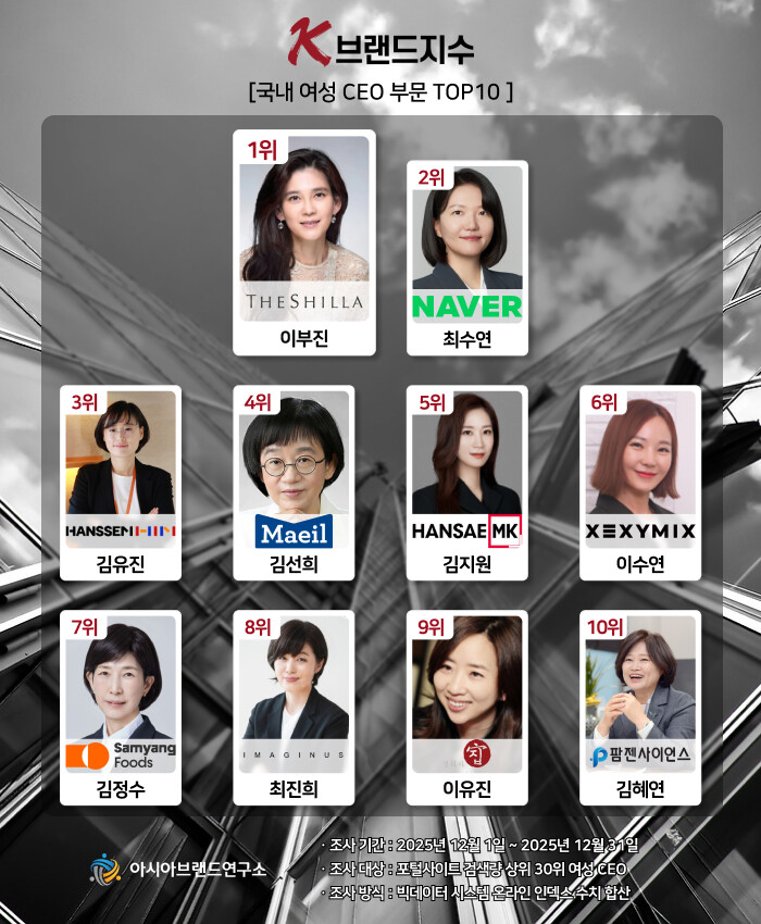한정근 아시아브랜드연구소 대표는 “이번 여성 CEO 부문은 기업의 재무적 성과뿐만 아니라, 리더 개인의 매력도와 소통 능력이 기업 가치에 절대적인 영향을 미치는지를 보여주는 첫 지표"라며 "1위를 차지한 이부진 사장과 2위 최수연 대표가 보여준 '글로벌 감각'과 '혁신적 리더십'은 물론, K-푸드 열풍의 주역인 김정수 부회장과 콘텐츠 시장을 선도하는 이유진 대표의 상위권 안착에 주목해야 한다"고 설명했다.
