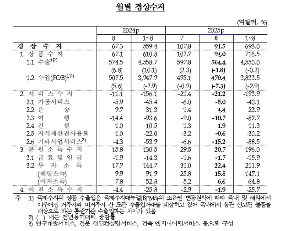 한국은행이 2일 발표한 국제수지 잠정 통계를 보면 8월 경상수지가 91억5000만달러(약 12조8000억원) 흑자로 집계됐다. 7월(107억8000만달러)보다 줄었으나 8월 기준으로는 역대 최대규모다.