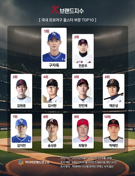 K-브랜드지수 프로야구 올스타 부문은 1위 구자욱(삼성)에 이어 2위 전준우(롯데), 3위 김원중(롯데), 4위 김서현(한화), 5위 전민재(롯데), 6위 채은성(한화), 7위 김지찬(삼성), 8위 송성문(키움), 9위 최형우(KIA), 10위 박해민(LG)이 TOP10의 영예를 차지했다.