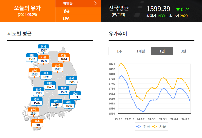 25일 한국석유공사 유가정보시스템 오피넷에 따르면, 전국 평균 휘발유 가격은 전일보다 1.28원 내린 리터당 1599.39원을 기록했다.
