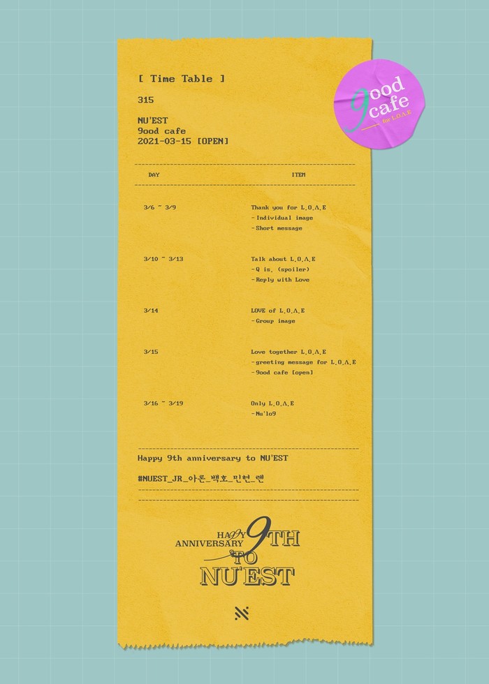 뉴이스트는 지난 4일 오후 공식 SNS 채널을 통해 ‘2021 Ha99y 9th anniversary to NU’EST’ 라는 문구와 함께 타임 테이블을 공개, 오는 3월 15일 데뷔 9주년을 앞두고 다채로운 콘텐츠를 선사할 것을 예고해 글로벌 팬들의 열띤 반응을 얻고 있다.