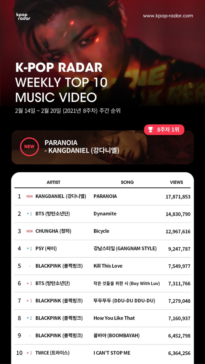 강다니엘의 신곡 ‘PARANOIA(파라노이아)’ 뮤직비디오는 케이팝 레이더 8주차 집계 기간 (2월 14일 ~2월 20일) 동안 1,787만 뷰를 기록하며 1위에 올랐다.