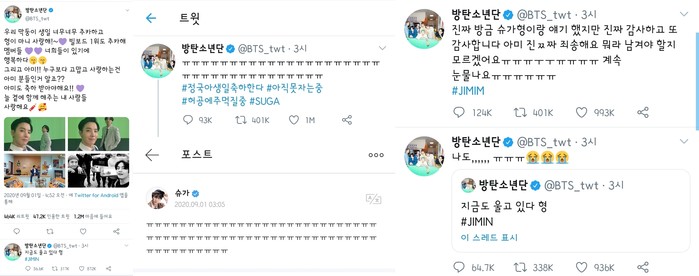 슈가는 방탄소년단 팬페이지 위버스에 기쁨의 눈물을 표시한 후 트위터에는 "#정국아생일축하한다 #아직못자는 중 #허공에주먹질중"이라고 적었다.