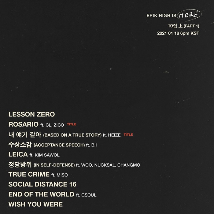 에픽하이(타블로, 미쓰라, 투컷)는 지난 12일 공식 SNS 계정을 통해 정규 10집의 파트 1 ‘Epik High Is Here 上 (에픽하이 이즈 히어 上)’ 풀 트랙리스트 이미지와 더블 타이틀 “내 얘기 같아”와 “Rosario”의 한줄 가사 이미지를 공개했다.