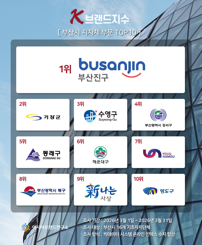 ‘K-브랜드지수’ 부산시 지자체 부문은 1위 부산진구에 이어 기장군(2위), 수영구(3위), 부산 강서구(4위), 동래구(5위), 해운대구(6위), 부산 남구(7위), 부산북구(8위), 사상구(9위), 영도구(10위) 등이 TOP10에 이름을 올렸다.