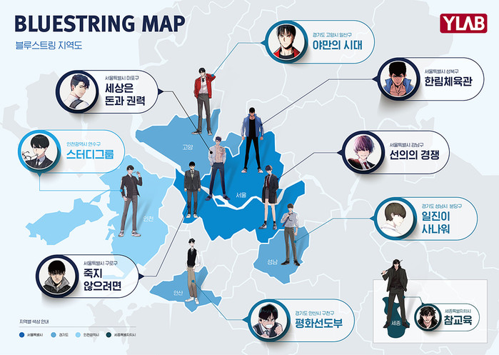 이번에 처음 공개된 ‘블루스트링 지역도’는 각 웹툰이 서울특별시, 경기도, 인천광역시 등의 지역을 배경으로 하고 있음을 보여준다. 각 지역을 지키거나, 거주하는 주인공들이 개별적인 스토리에서 더 나아가 전국 규모 세계관으로 확장해 나갈 청사진을 제시하고 있다.