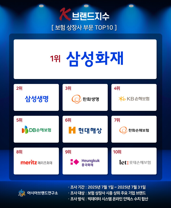 이번 K-브랜드지수 보험 상장사 부문은 보험 상장사 시총 상위 주요 기업 브랜드를 대상으로, 2025년 7월 1일부터 7월 31일까지의 온라인 빅데이터 1276만 3922건을 분석했다.