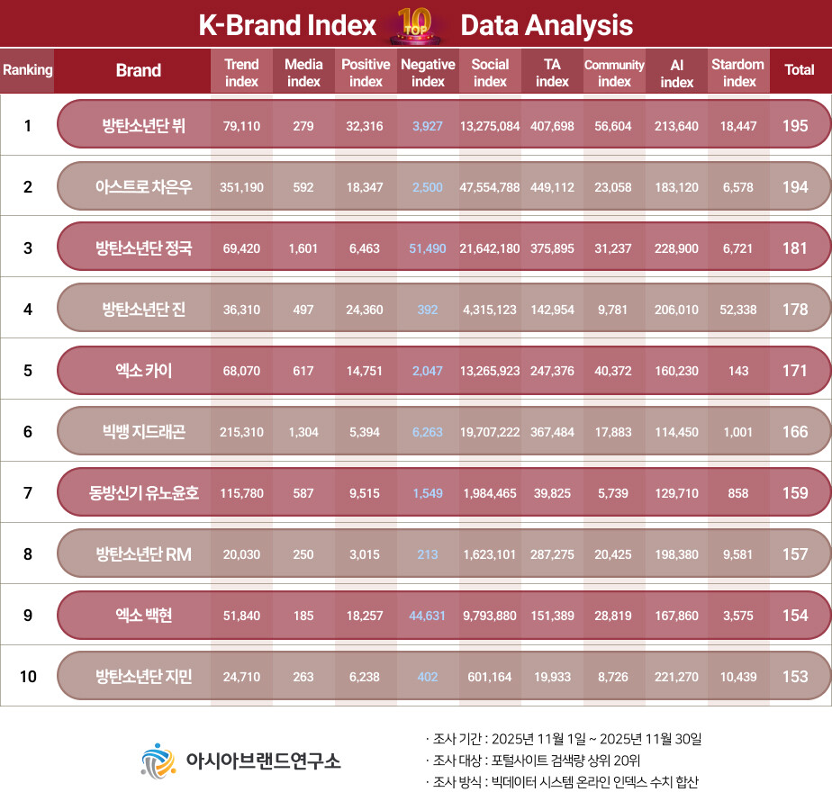 이번 K-브랜드지수 보이그룹 개인 부문은 포털사이트 검색량 상위 20위를 대상으로, 2025년 11월 1일부터 11월 30일까지의 온라인 빅데이터 2억 898만 4602건을 분석했다.