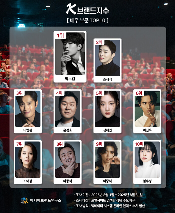 이번 K-브랜드지수 배우 부문은 포털 사이트 검색량 상위 주요 배우를 대상으로, 2025년 8월 1일부터 8월 31일까지의 온라인 빅데이터 2억 3325만 485건을 분석했다.