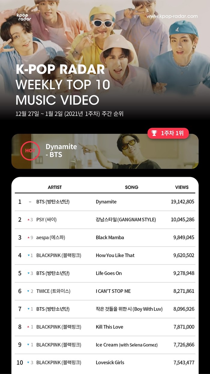 방탄소년단의 ‘Dynamite(다이너마이트)’ 뮤직비디오는 케이팝 레이더 2021년 1주 차(12월 27일~1월 2일) 차트에서 1,914만 뷰를 기록하며 1위에 올랐다. 지난 해 마지막 주간 케이팝 레이더 정상을 차지한데 이어 새해에도 왕좌를 지킨 것이다.
