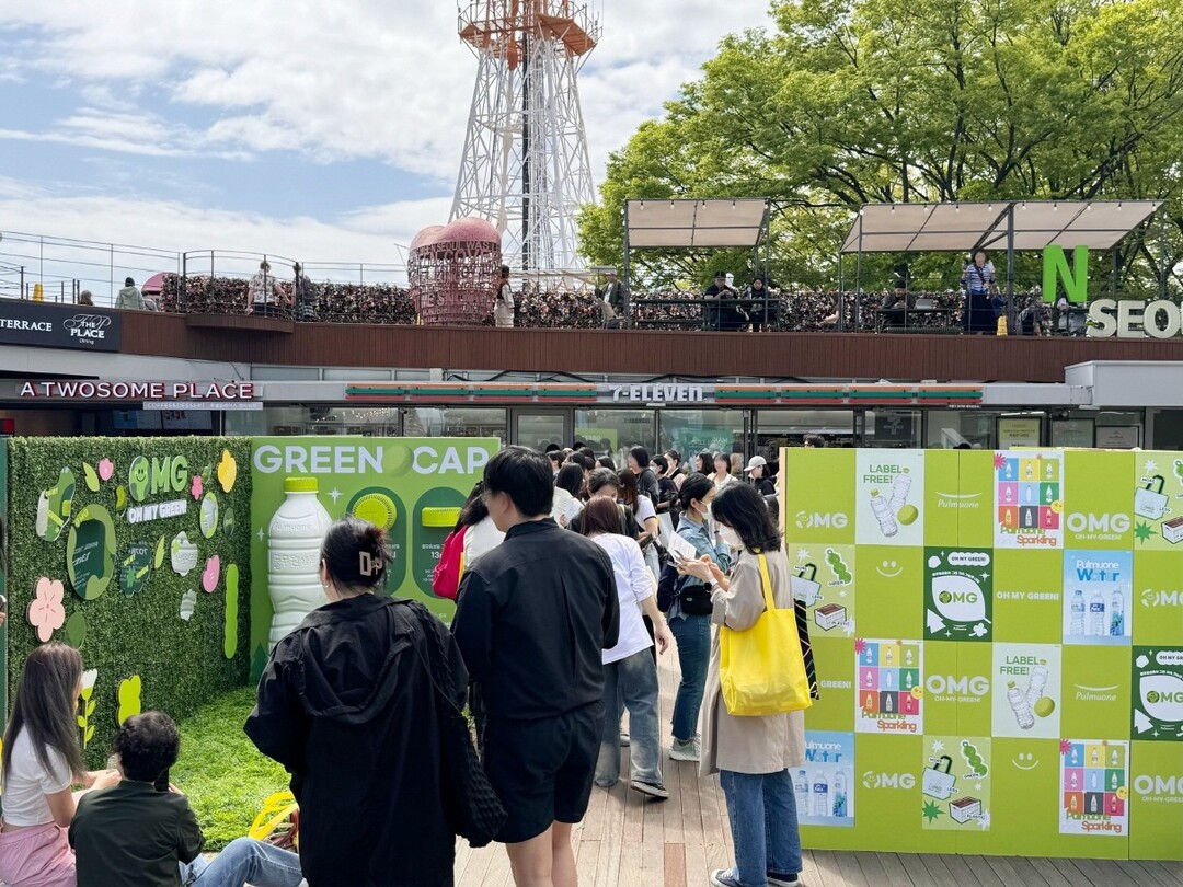 풀무원샘물은 지속가능한 내일을 그려가는 브랜드 캠페인 ‘OH-MY-GREEN(OMG)’ 콘셉트에 맞춰 목재펄프와 종이로 만든 ‘허니콤보드’를 사용해 부스를 꾸렸고, 부스 내부는 ‘그린라벨존’ ‘그린캡존’ ‘그린페트존’ ‘그린이벤트존’ 등의 체험공간을 조성했다.