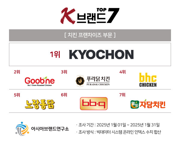 2025년 1월 1일부터 31일까지의 온라인 빅데이터 1282만 73건을 대상으로 조사된 K-브랜드 톱7 치킨 프랜차이즈 부문은 트렌드(Trend)·소셜(Social)·미디어(Media)·커뮤니티(Community)·긍부정(Positive/Negative) 인덱스 등의 핵심 빅데이터에 대한 가중치 배제 합산 수치로 산출됐다.